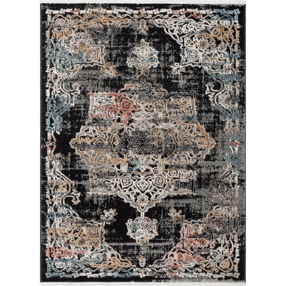 The bright colors, bold blacks and a distressed looks give The Indira Collection a cutting-edge style perfect for contemporary spaces. Its delightfully soft pile is accented with variegated shrink yarns for a unique 3D look and worn feel. A cotton fringe on either end completes the stately look.