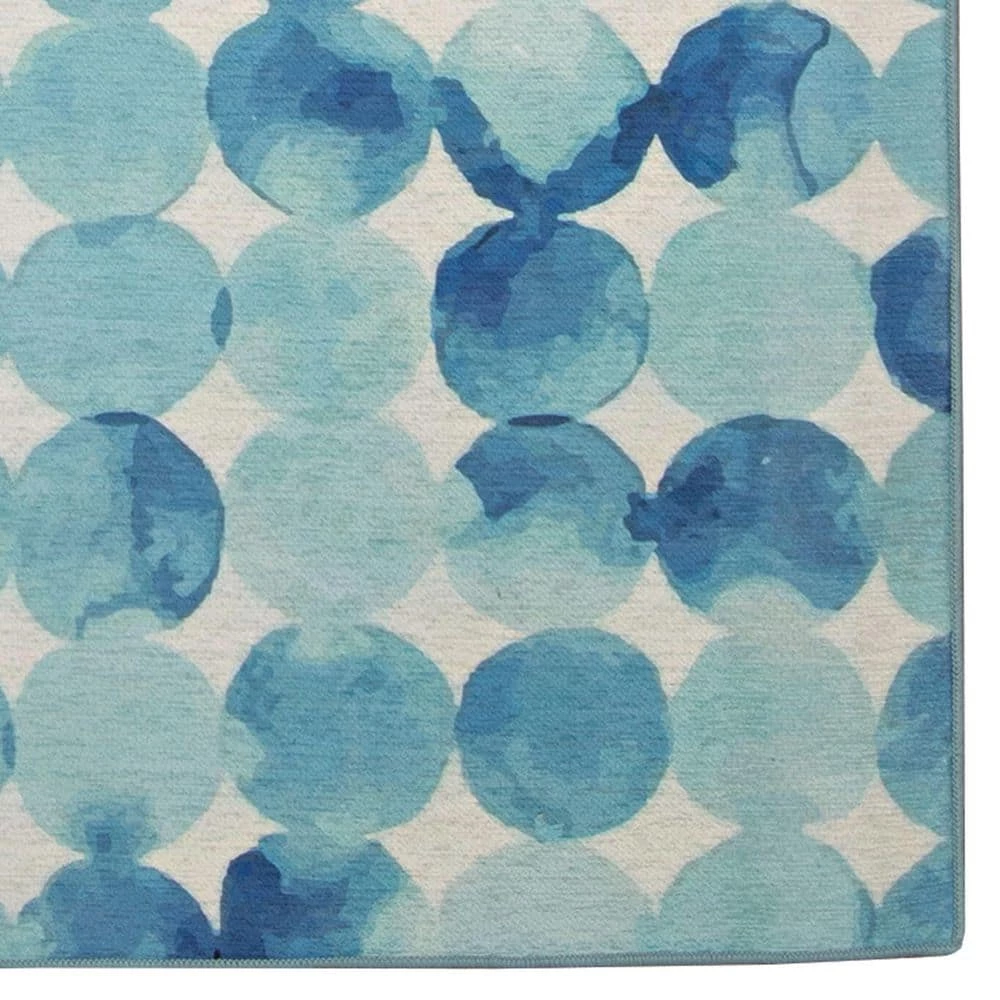 - Watercolor reminiscent blue circles in varying tones are soothing in any space