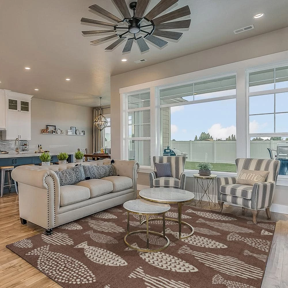Lay the groundwork for a fun and inviting living space with this Lisbon DelMar Beige Ivory 8 ft. x 10 ft. Area Rug. The fish pattern in muted tones pairs wonderfully in a variety of decor settings, while the soft texture ensures comfort for you and your family. Made of 100% polyester, this area rug is a breeze to clean and will withstand foot traffic for years to come. The medium pile construction is ideal for placement under furniture or out in the open and will not obstruct doorways.