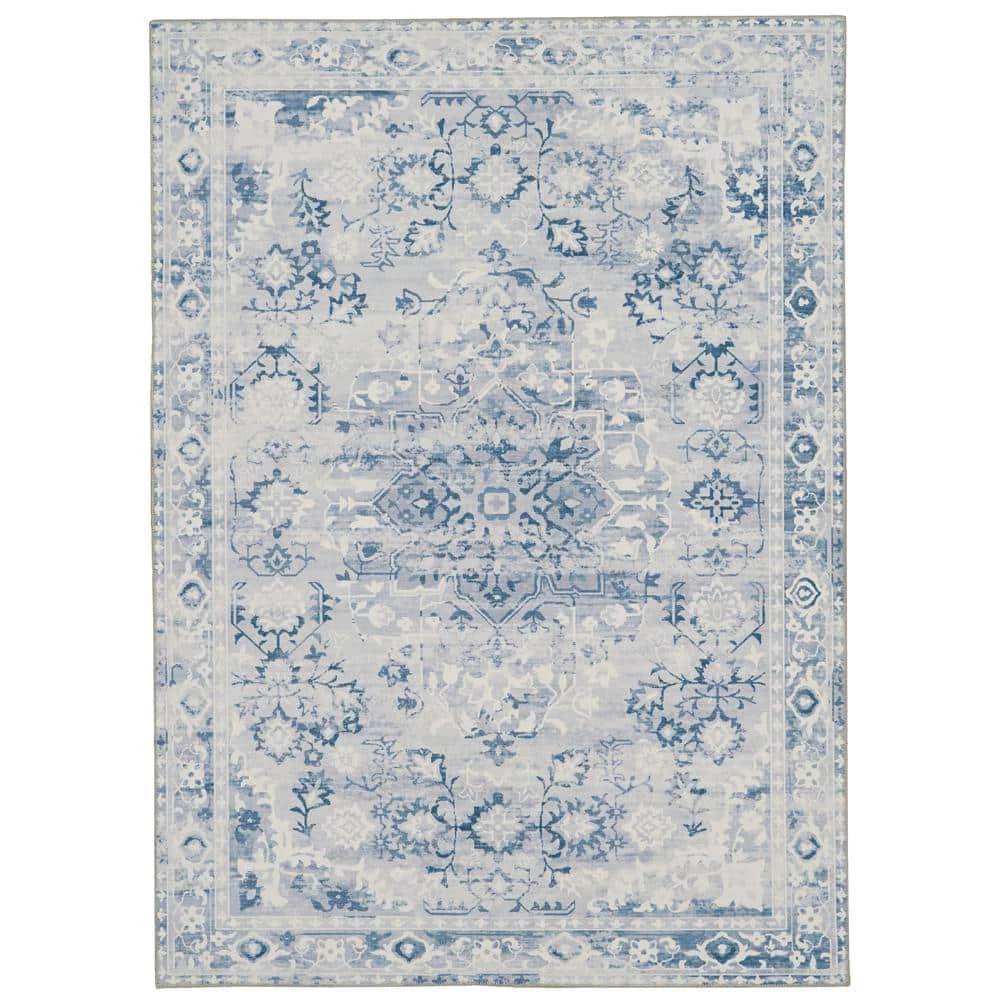 - Antique inspired, distressed design features shades of soothing greys and blues